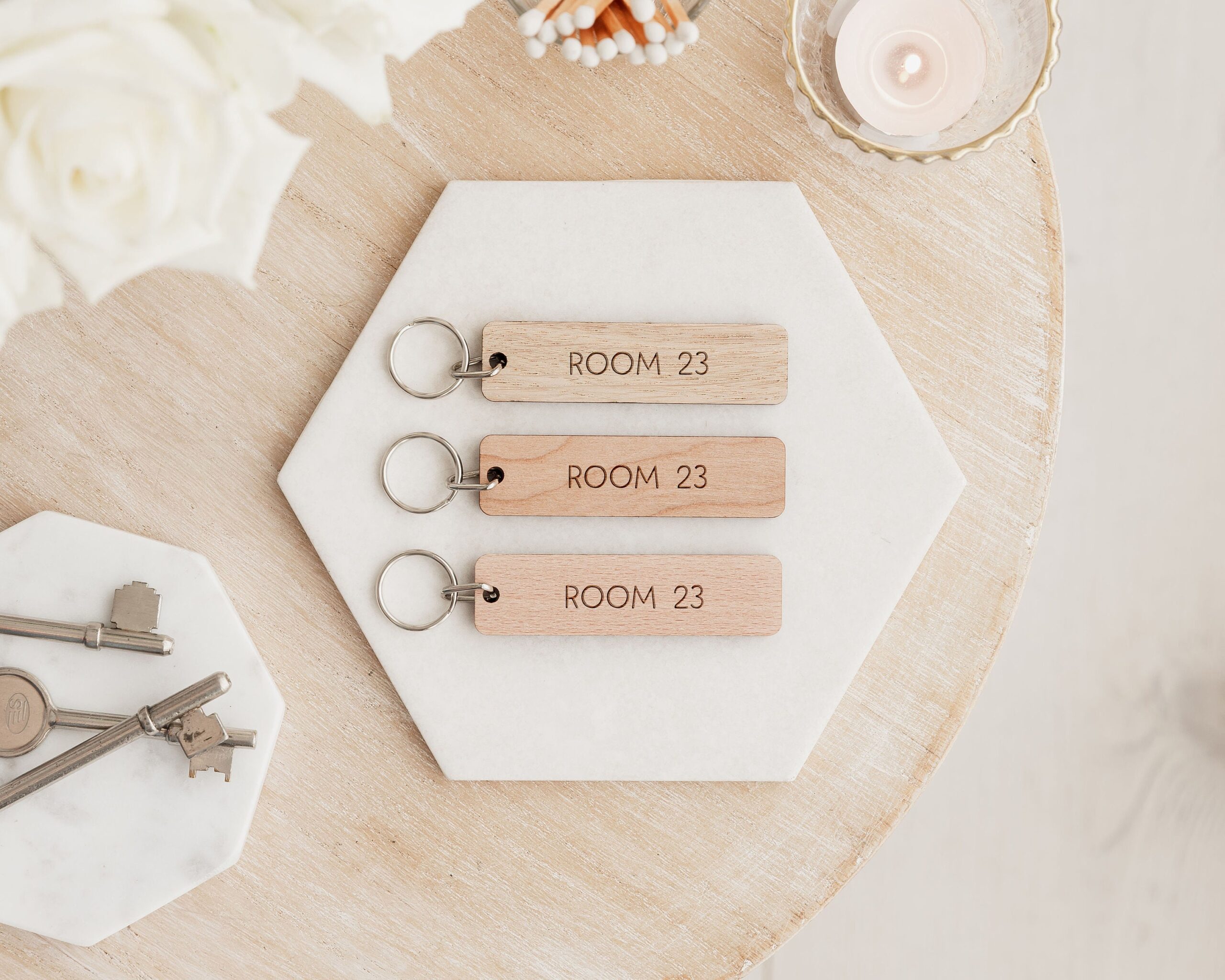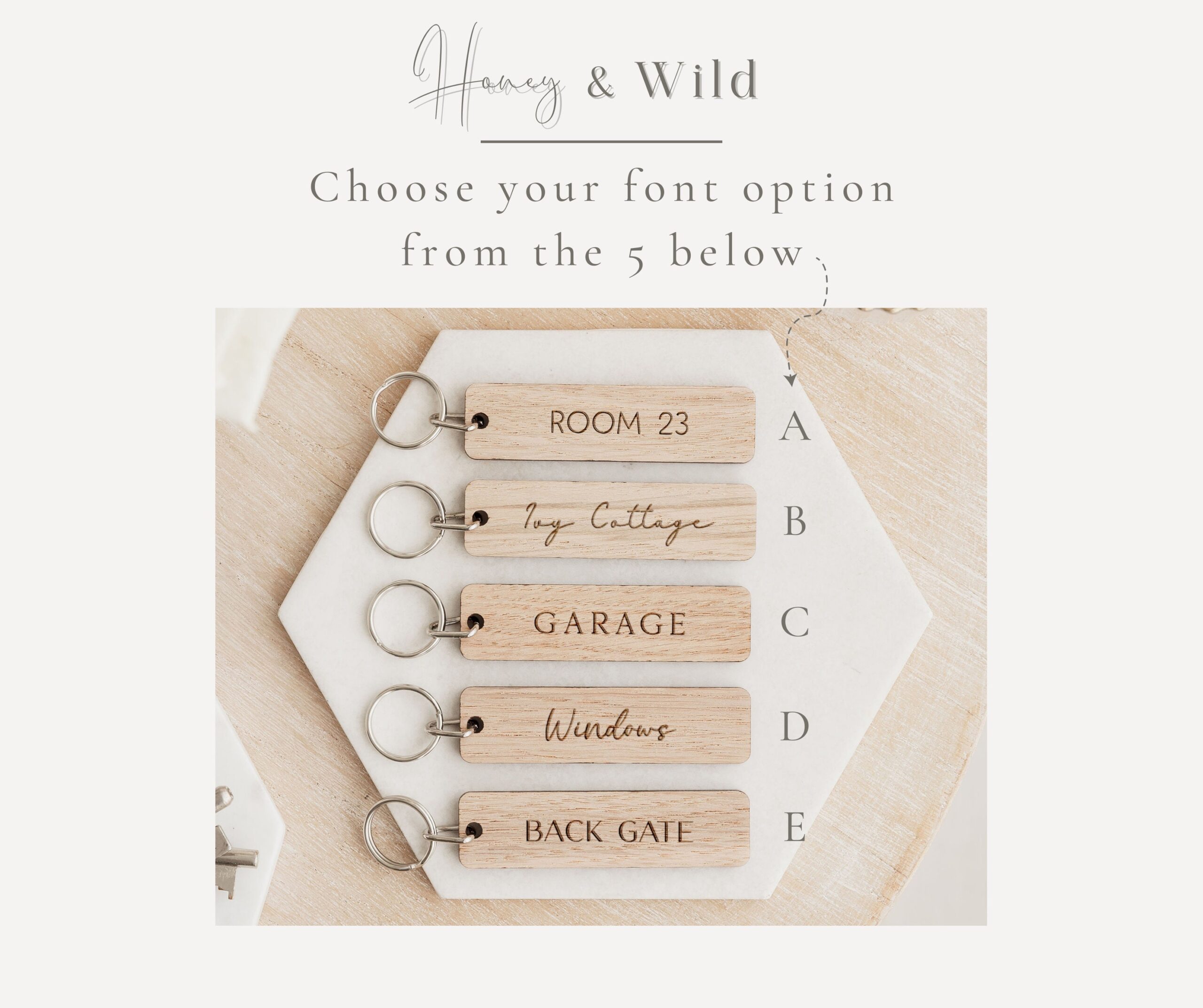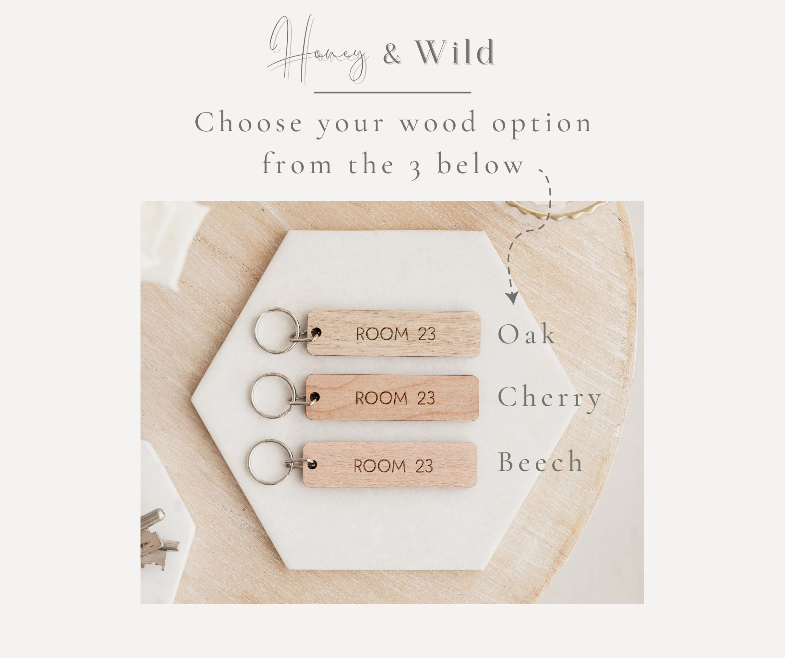 A beautiful laser engraved personalised keyring to help keep your keys organised around your home, work or holiday let/B\&B—the options are endless for their use! Choose from 4mm Oak, Cherry or Walnut – these are all real wood veneers which means they may have a slightly different grain and/or tone to the ones photographed in the listing. Every piece is as unique as the person using it.