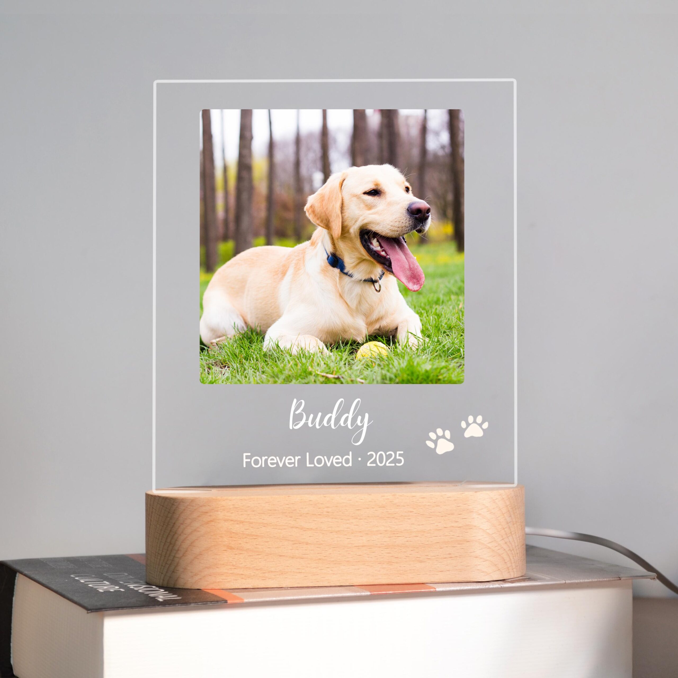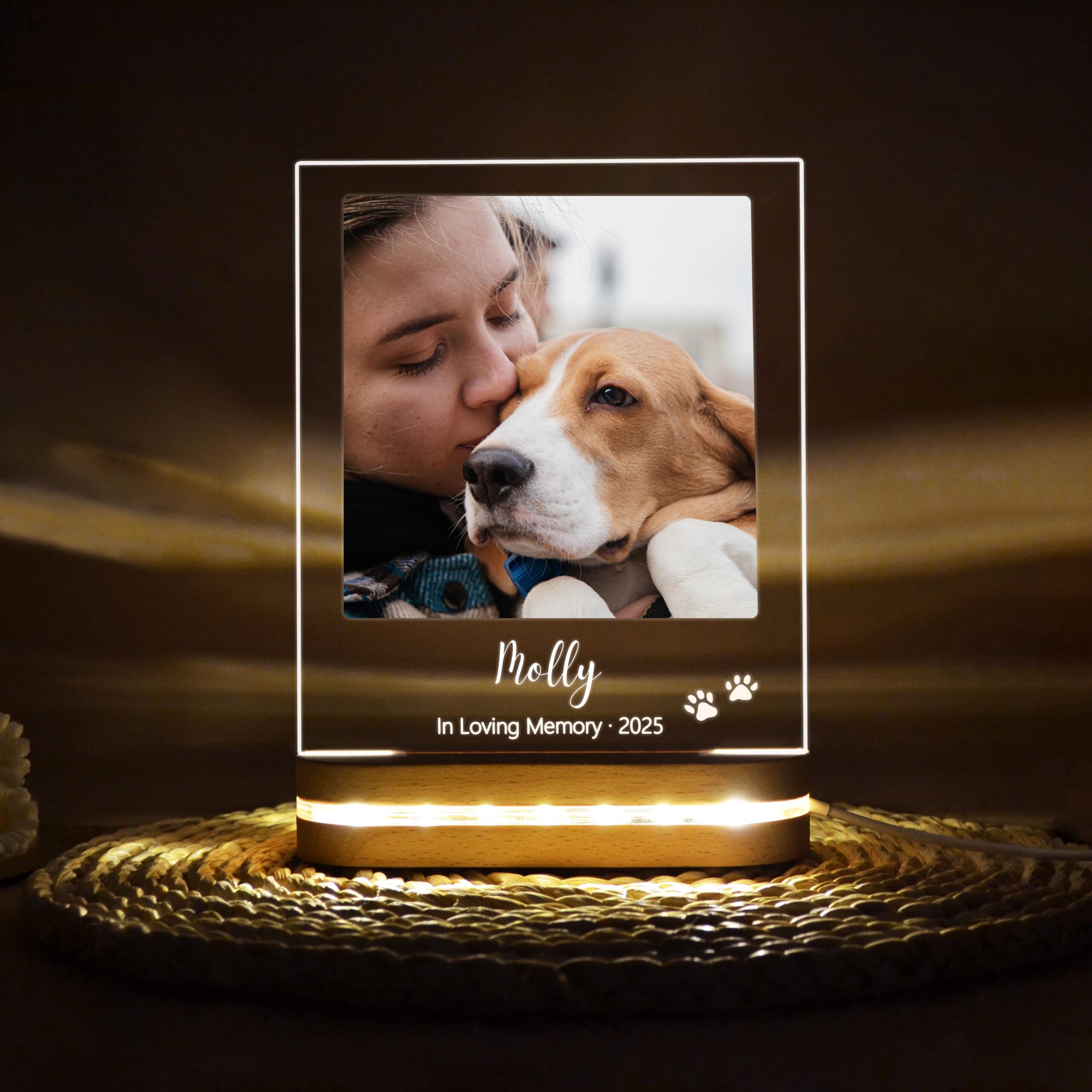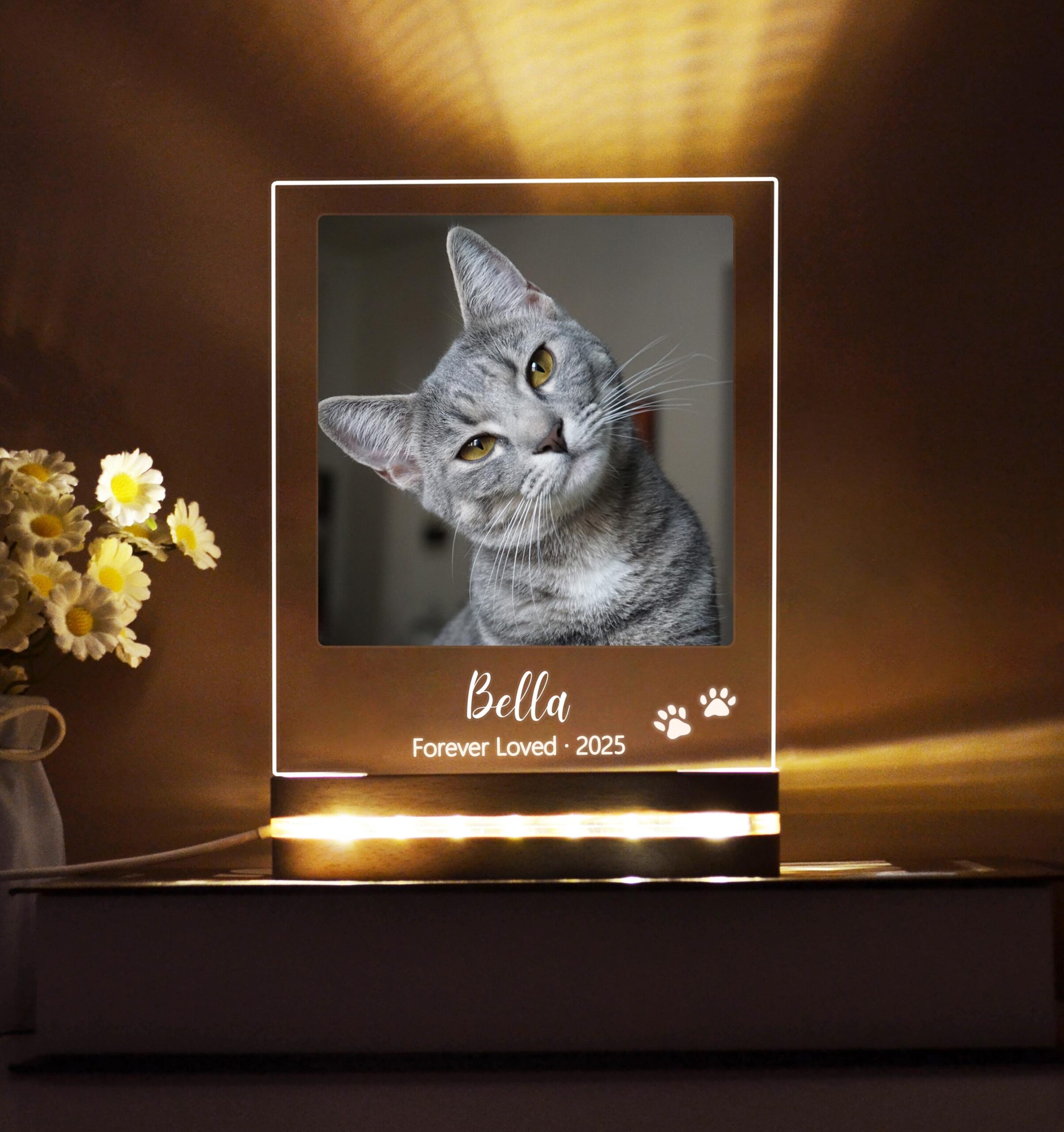 The clean acrylic panel showcases your chosen personalization — your pet’s name, special dates, a heartfelt message, and even their image — all gently lit by a soft LED base that adds warmth to any room.
